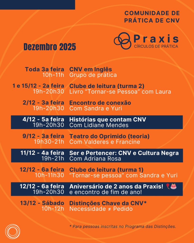 Espaço de aprendizado contínuo, apoio mútuo e crescimento conjunto para pessoas interessadas em estudar e vivenciar a Comunicação Não-Violenta (CNV) e a Democracia Profunda na prática, em companhia.