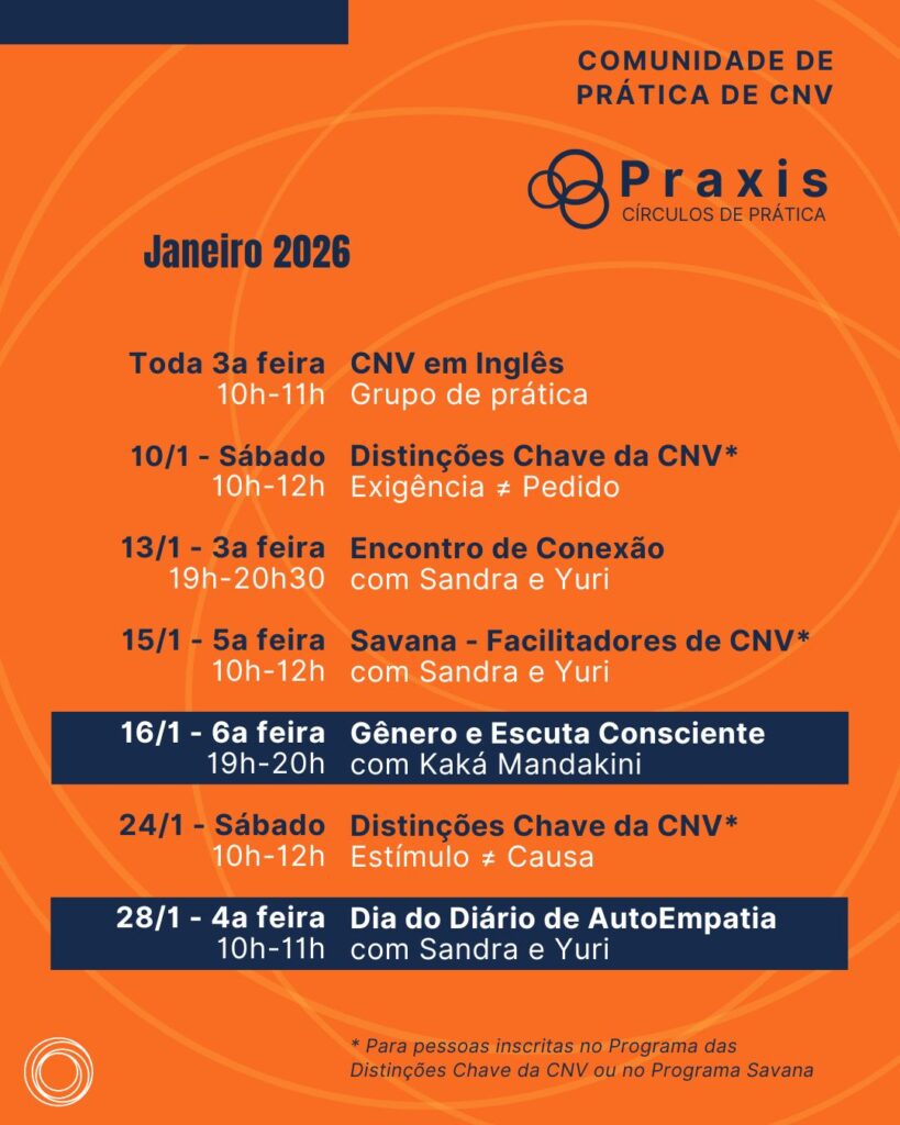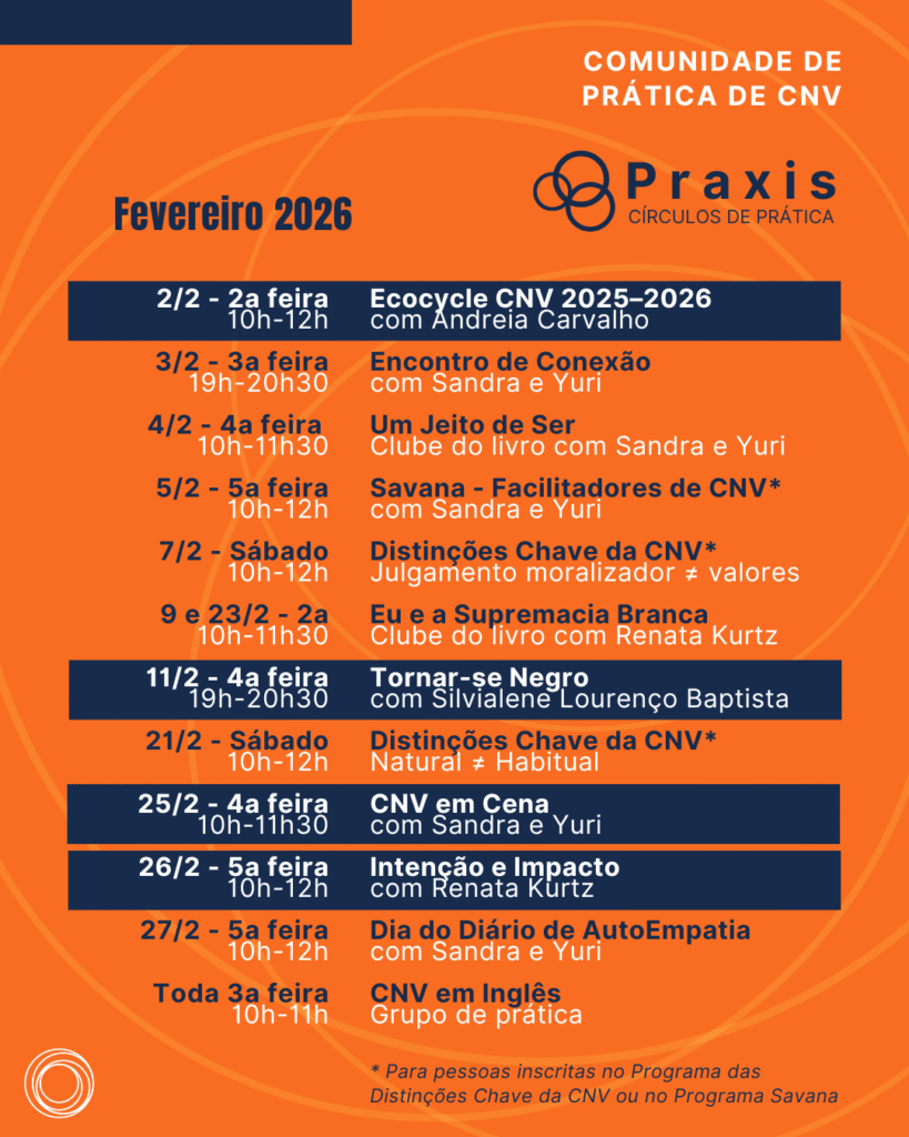 Programa anual com encontros quinzenais online ao vivo, para quem já conhece a CNV e quer aprofundar em sua própria vida o entendimento, a integração e a vivência do paradigma da CNV.