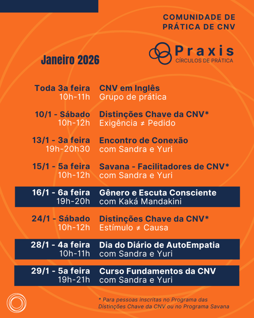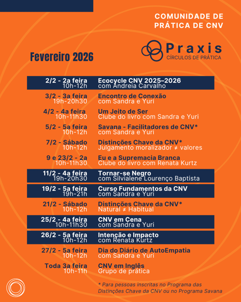 Programa anual com encontros quinzenais online ao vivo, para quem já conhece a CNV e quer aprofundar em sua própria vida o entendimento, a integração e a vivência do paradigma da CNV.